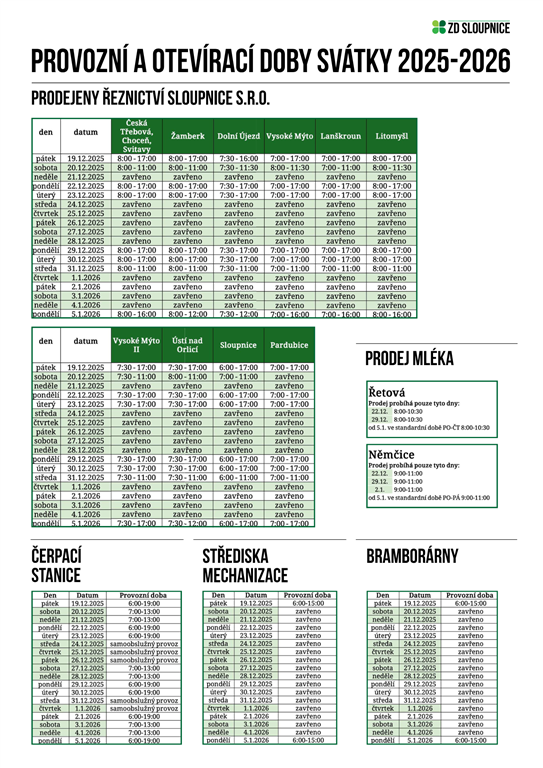 Mechanizace bude v průběhu vánočních svátků od 20 prosince 2025 až do 4. ledna 2026 ZAVŘENÁ.